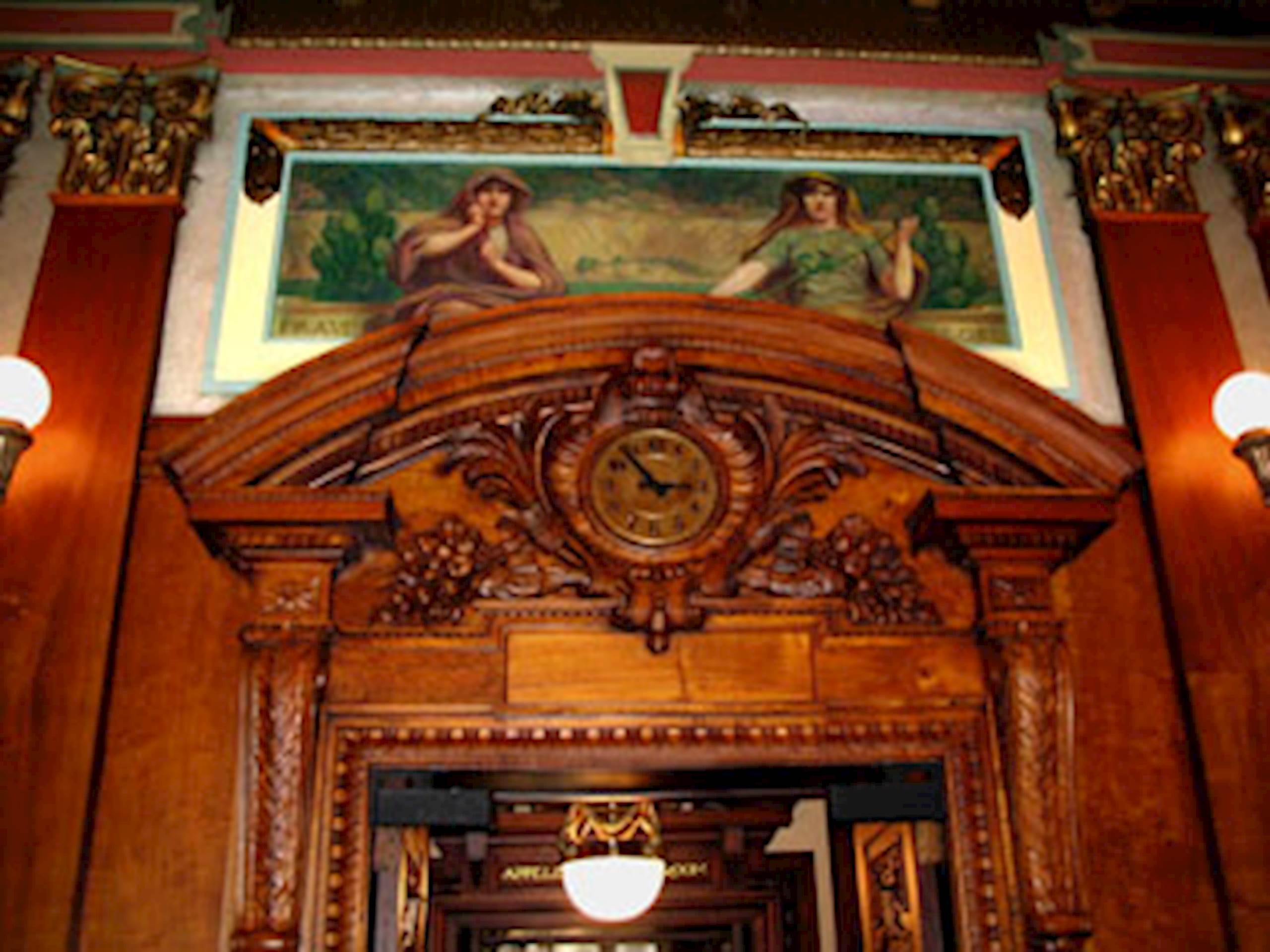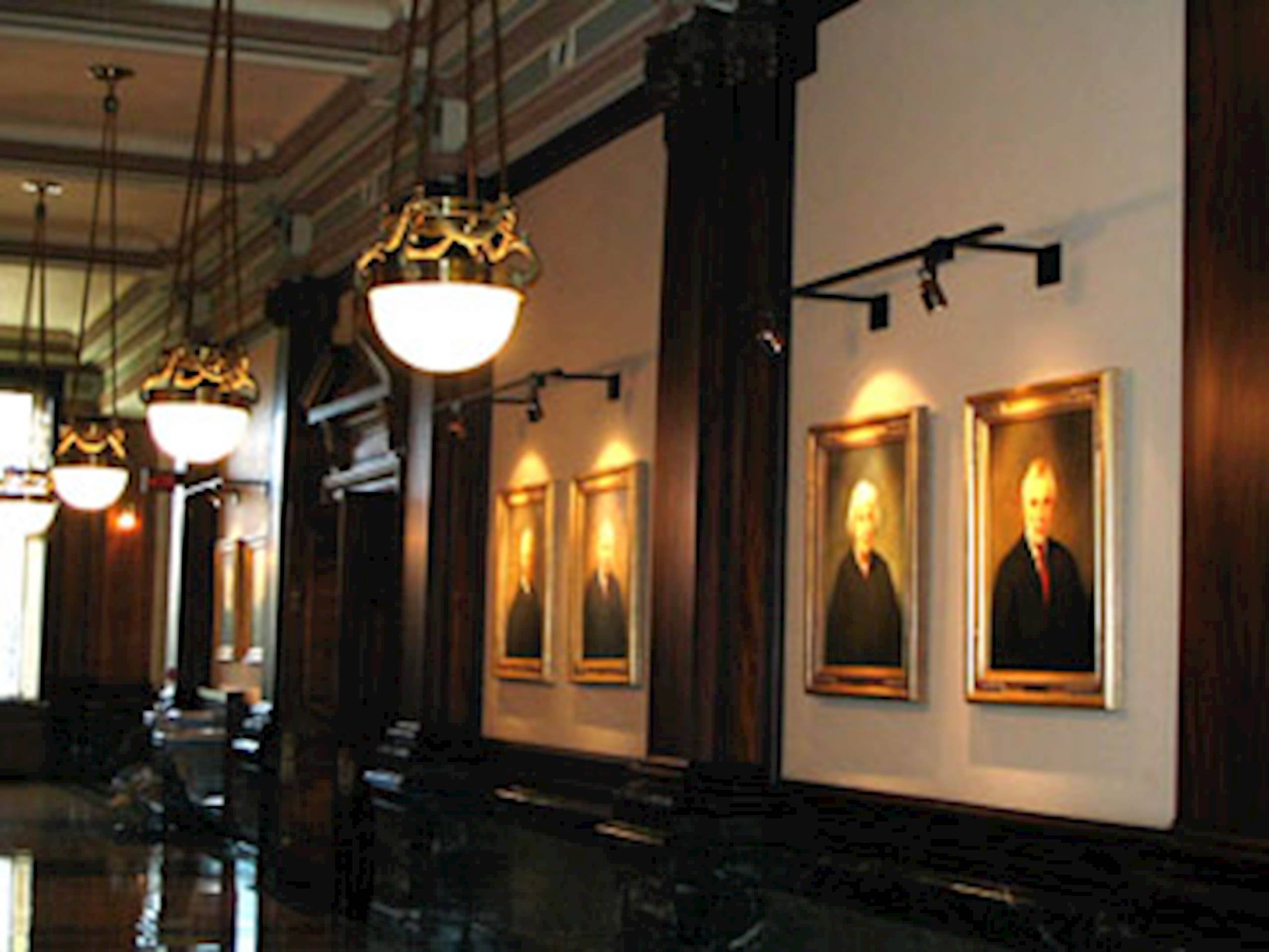 Images of the Illinois Supreme Court Building including: The exterior of the building, courtrooms, artwork, and the Supreme Court Library